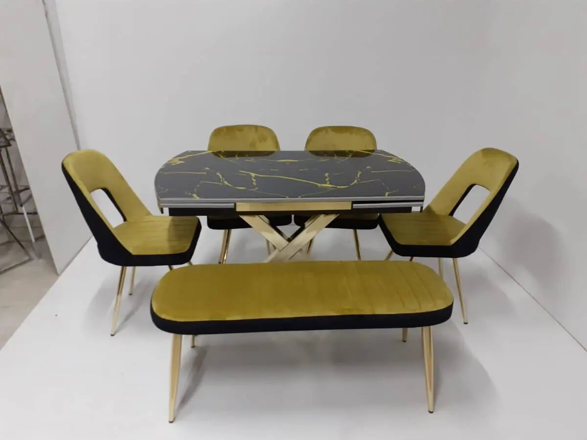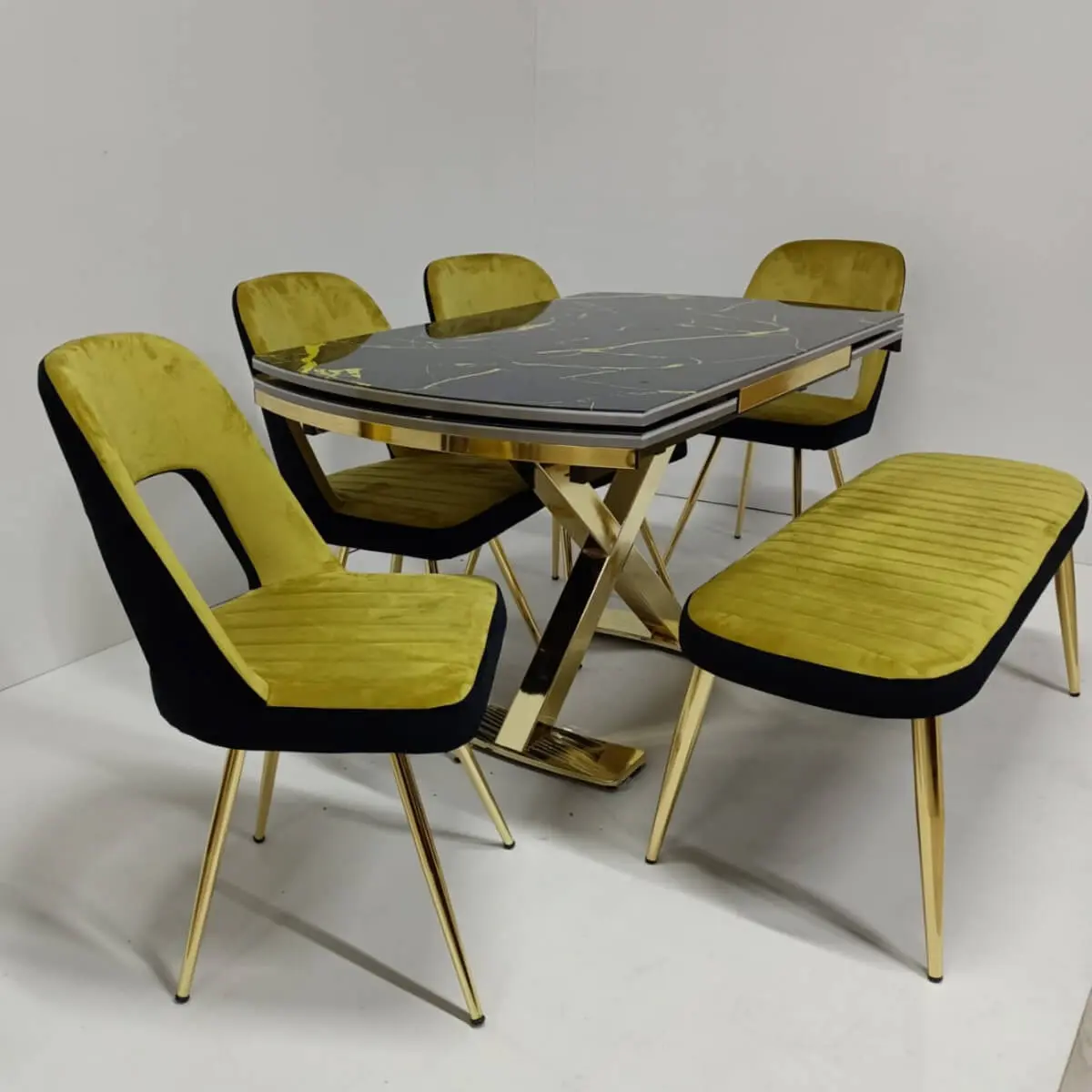 Takımda yer alan sandalyeler ve bank, ergonomik oturum yapısıyla rahatlık sağlar. Kadife dokulu döşemesi, hem şık bir görünüm hem de kolay temizlik avantajı sunar. Siyah ve altın tonlarının uyumu, yaşam alanınıza lüks ve modern bir atmosfer kazandırır.