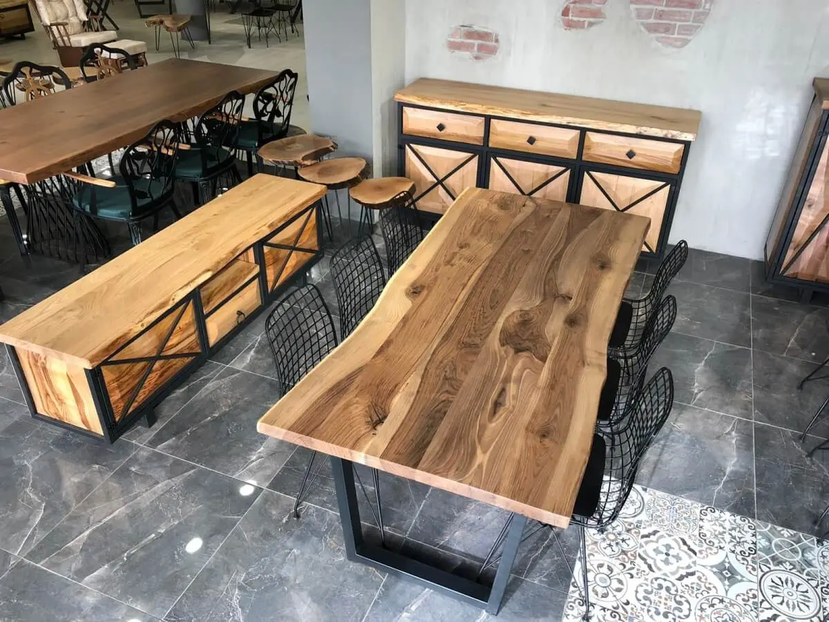 Ahşap Yemek Masası Takımı – Metal Ayaklı Kütük Masa