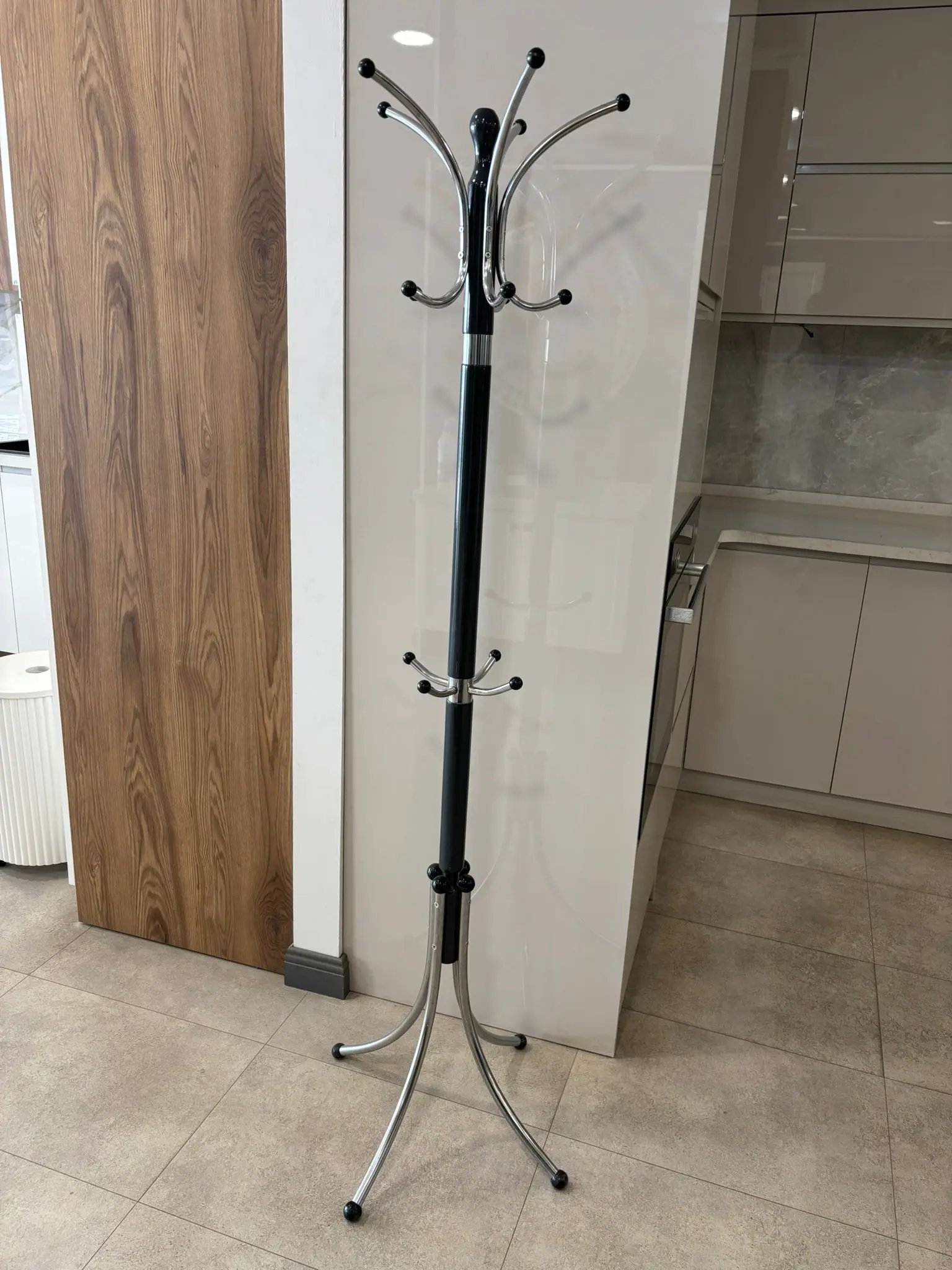 Metal ayaklı portmanto askılık. Siyah gövde ve parlak metal kollarıyla şık bir görünüm sunar. Üst kısımda 8, orta bölümde 4 asma kolu ile mont, şapka ve çantalarınızı düzenli tutun. Ev, ofis ve ticari alanlar için ideal.
