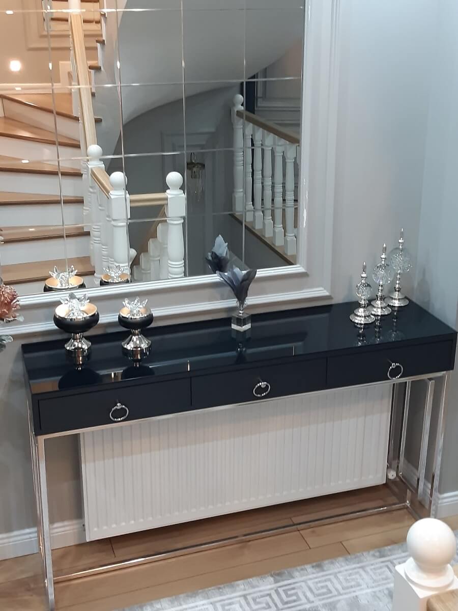 Antre ve koridor giriş dekorasyonu için vazgeçilmez ahşap aksesuar, modern dresuar modelleri. Kalorifer üstü, petek üstü siyah dresuar.